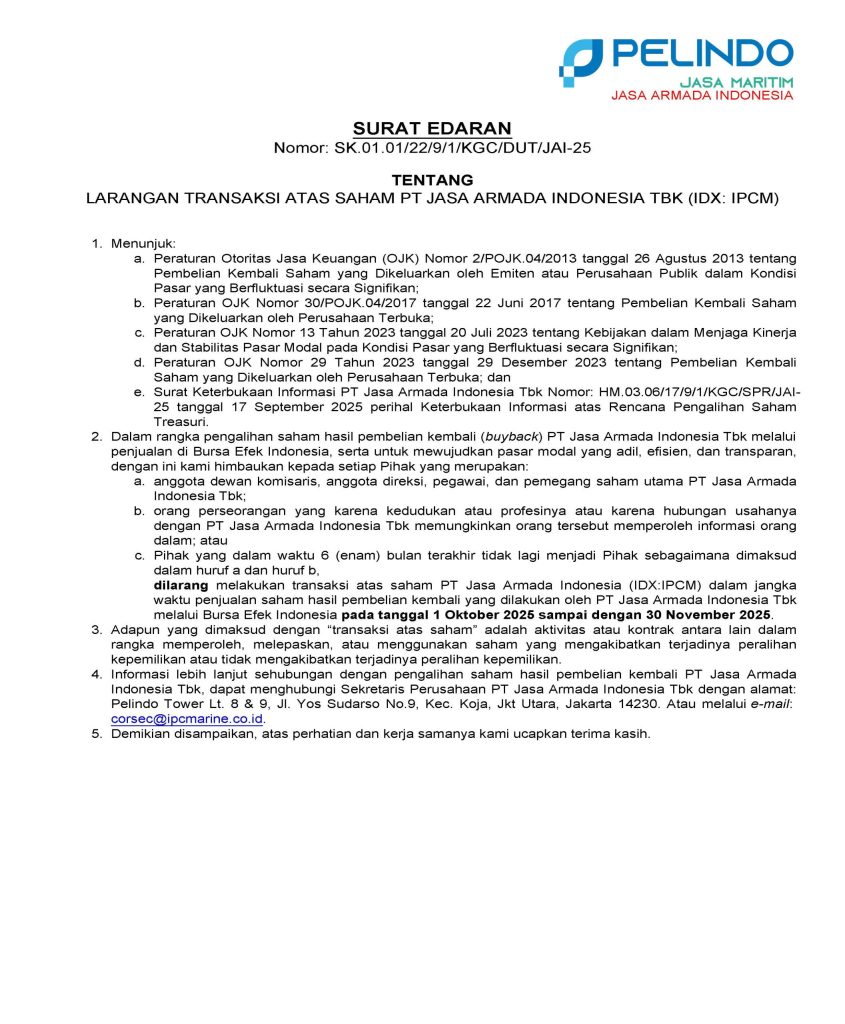 In addition, PT JAI Tbk, which has its own delegation of authority as a port business entity (BUP), also operates in 12 areas, including Patimban Port (Subang), Tersus FSRU Jawa Satu, Tersus FSRU Jawa Barat (Kep. Seribu), Tersus Cemindo Gemilang (Bayah-Banten), Tersus dan TUKS Kanci (Cirebon), STS Nipa (Batam), STS Ambang luar Sungai Musi, Meulaboh (Aceh), Weda Port and Laiwui Port.